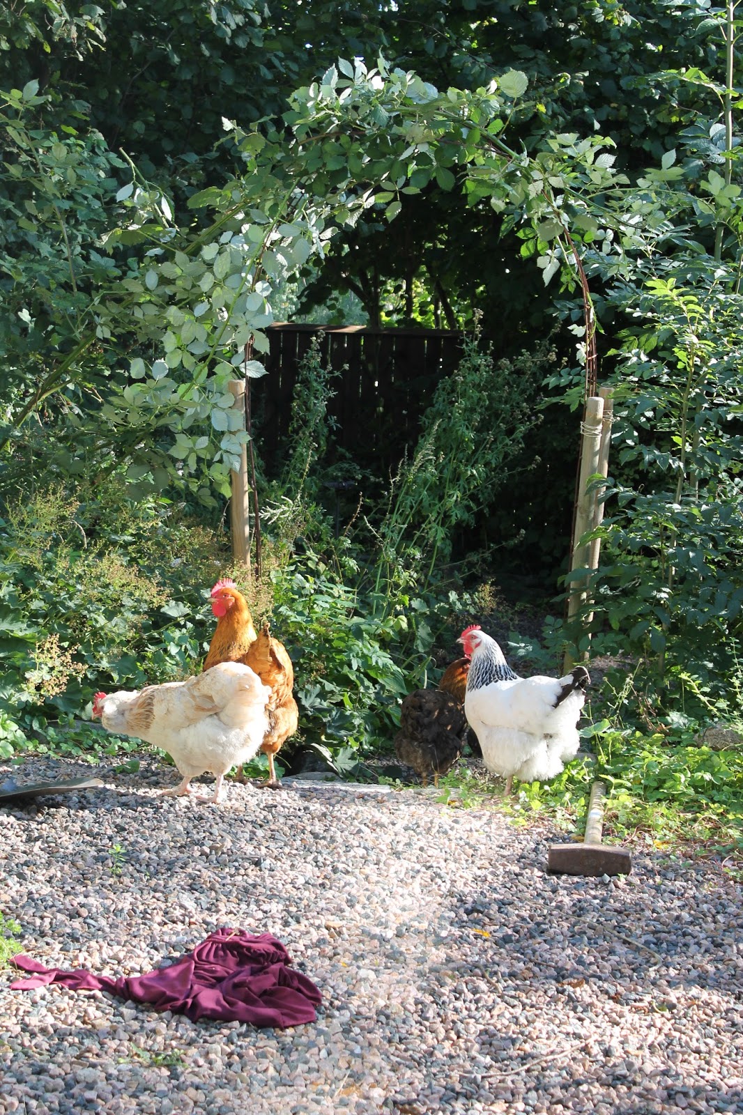 Att sätta upp en portal samt trassla in björnbärsgrenar i spaljén själv...utan extra händer...så att blodet droppar...då FÅR man skrika och svära så det osar, så att grannarna kanske hör, så att det inte är lämpligt. För det är f-n inte lätt.
